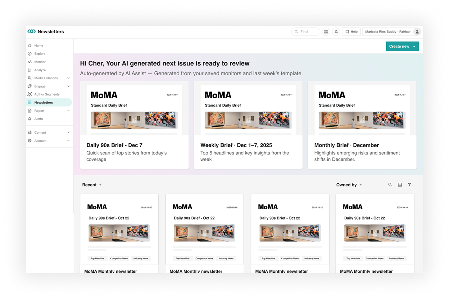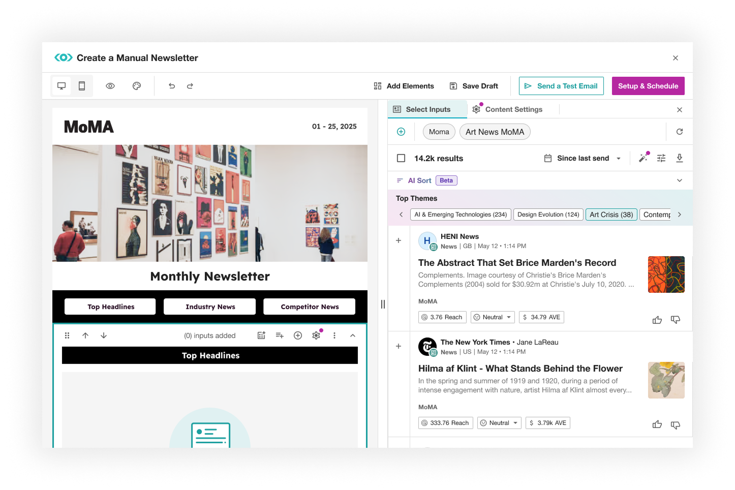 Meltwater Newsletter is the most-used touchpoint for marketing and communications teams — opened daily to scan, curate, and share media intelligence. I led the redesign from a static reporting tool into an AI-powered engagement system — enabling scalable content creation, intelligent prioritization, and faster time-to-insight.